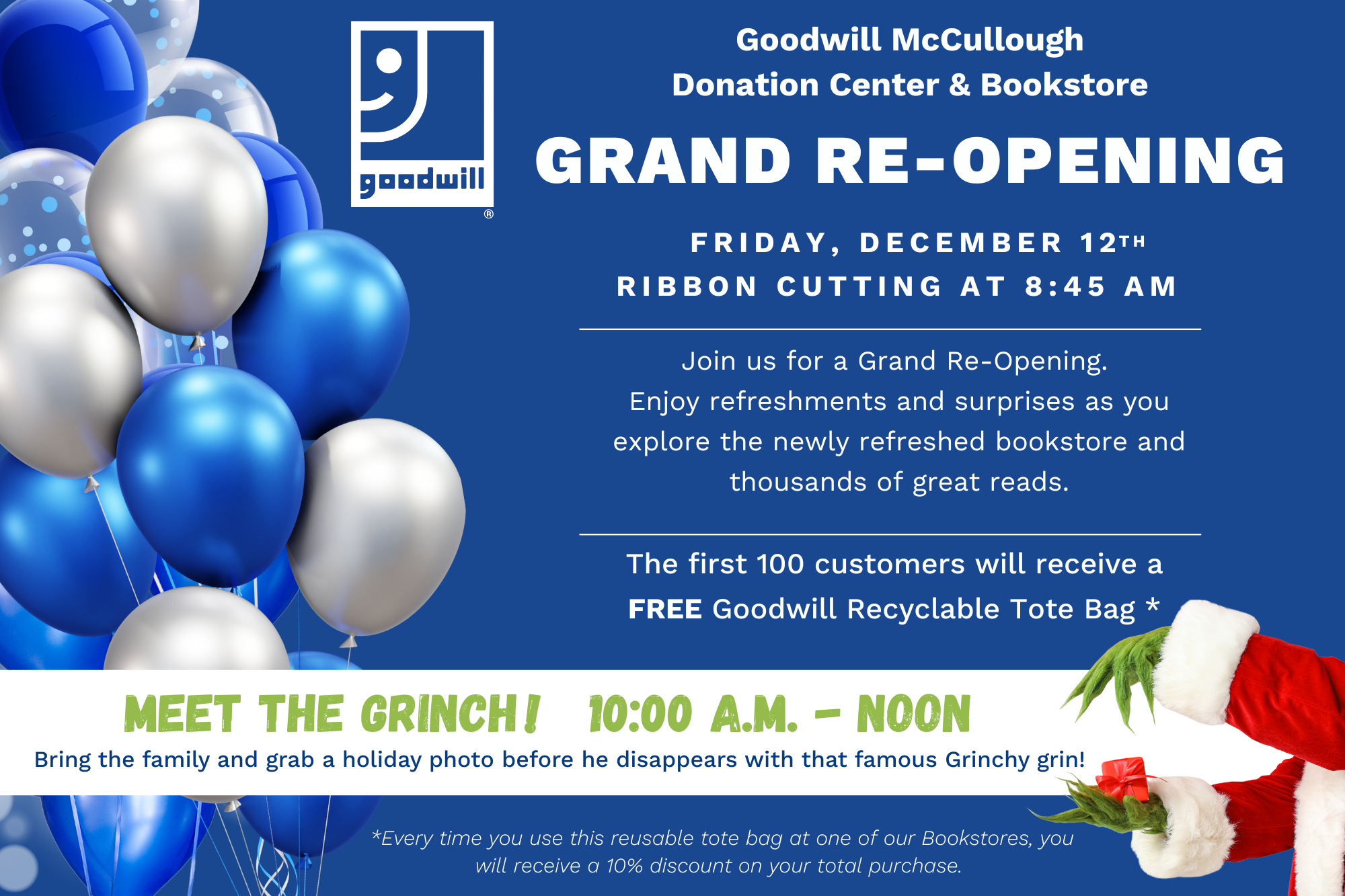 On behalf of Goodwill, we would personally like to invite you to celebrate the grand re-opening of the Goodwill McCullough Donation Center & Bookstore. Stop by on Friday, December 12th, for a community celebration featuring: